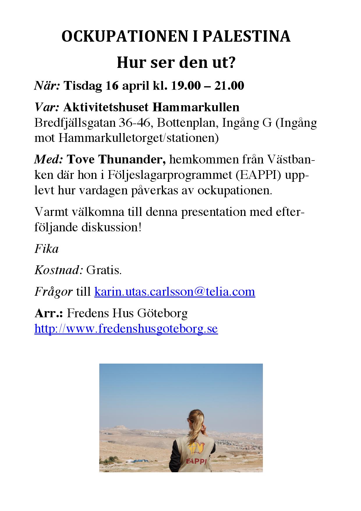 Tove Thunander har besökt Västbanken i Följeslagarprogrammet (EAPPI) 2018. Man kan läsa hennes reserapporter i https://foljeslagarprogrammet.se/foljeslagarna/tove/ Hon presenterar sig själv: Tove har varit följeslagare i 3 månader i Israel och Palestina med Följeslagarprogrammet (internationellt förkortat EAPPI). Programmet syftar till att bevaka brott mot mänskliga rättigheter och internationell humanitär rätt, samt fungera som skyddande närvaro på Västbanken. Föreläsningen är en ögonvittnesskildring om hur det ser ut på Västbanken och beskriver hur människor påverkas av ockupationen.